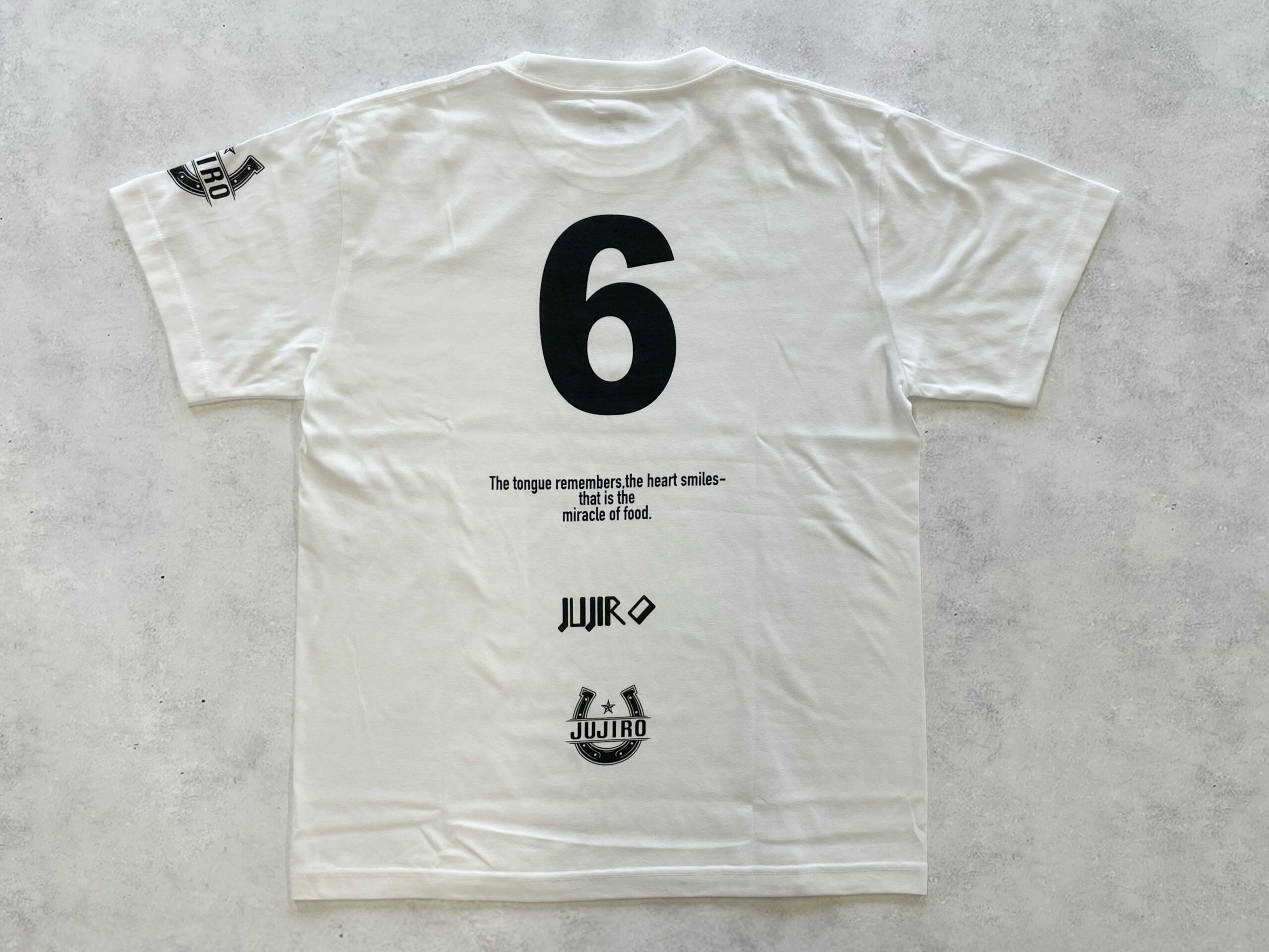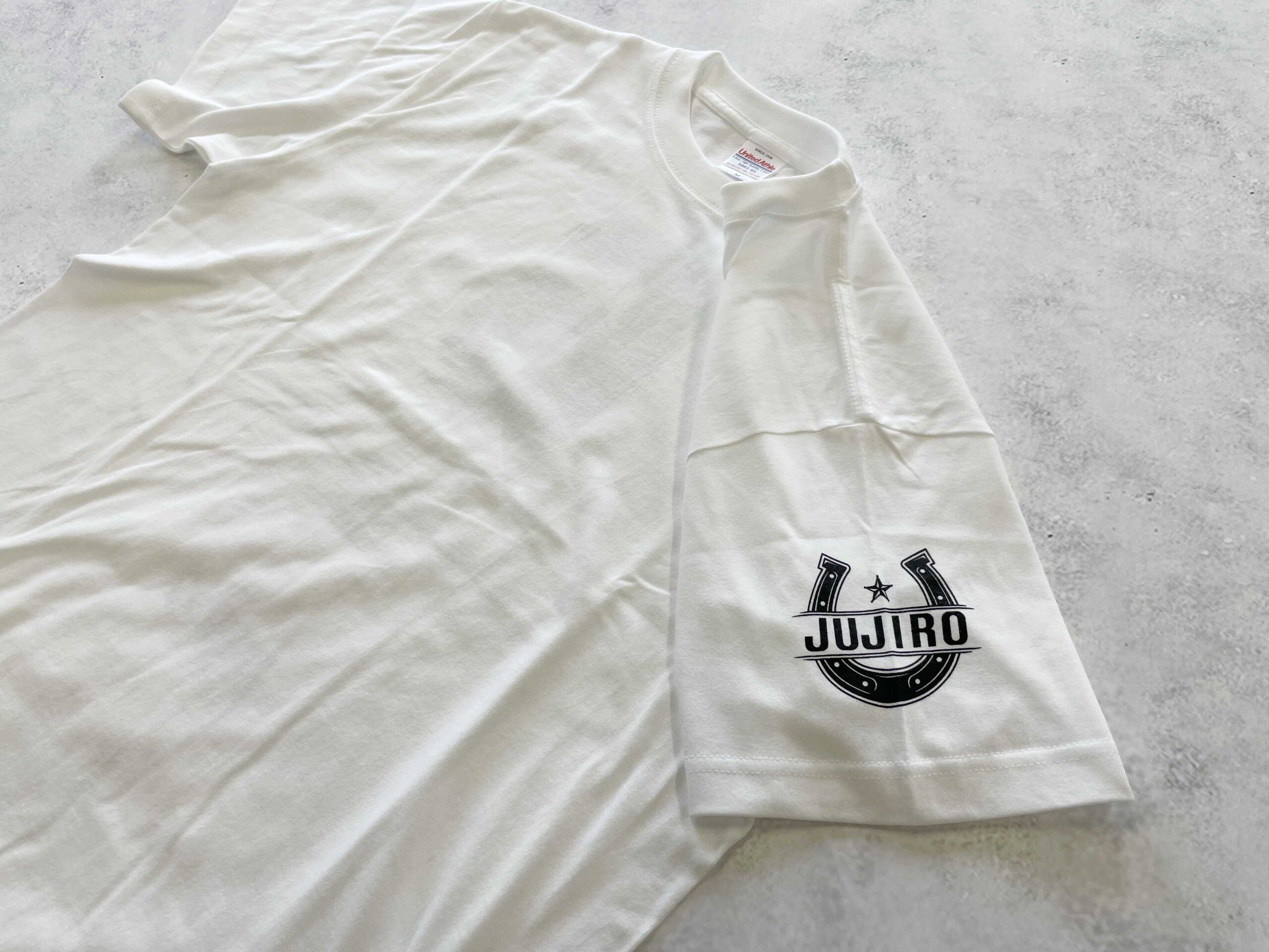 フロント部分には店名である 「JUJIRO」 を白色インクでプリントしました。