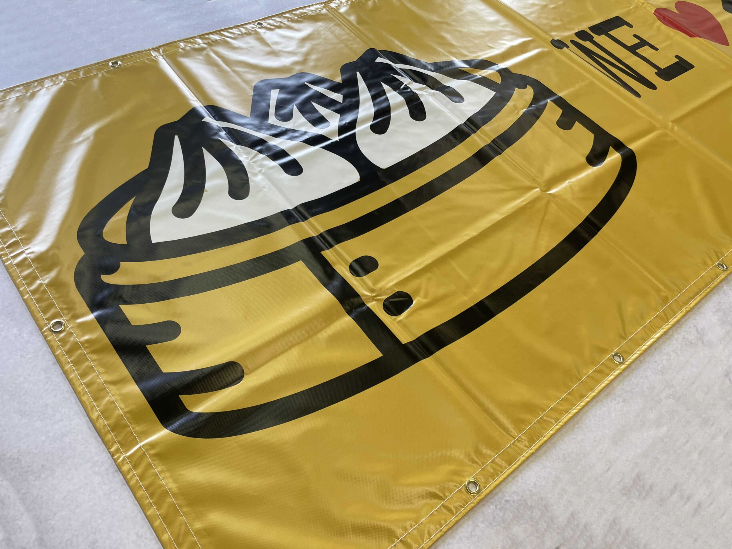 今回は屋外での使用が前提となるため、雨・風・直射日光といった厳しい環境でも長期間劣化しにくい 塩ビ素材(ターポリン) を採用。耐久性・防水性ともに優れているため、イベントはもちろん、普段の店頭掲示にも安心してご利用いただける仕上がりとなっています。