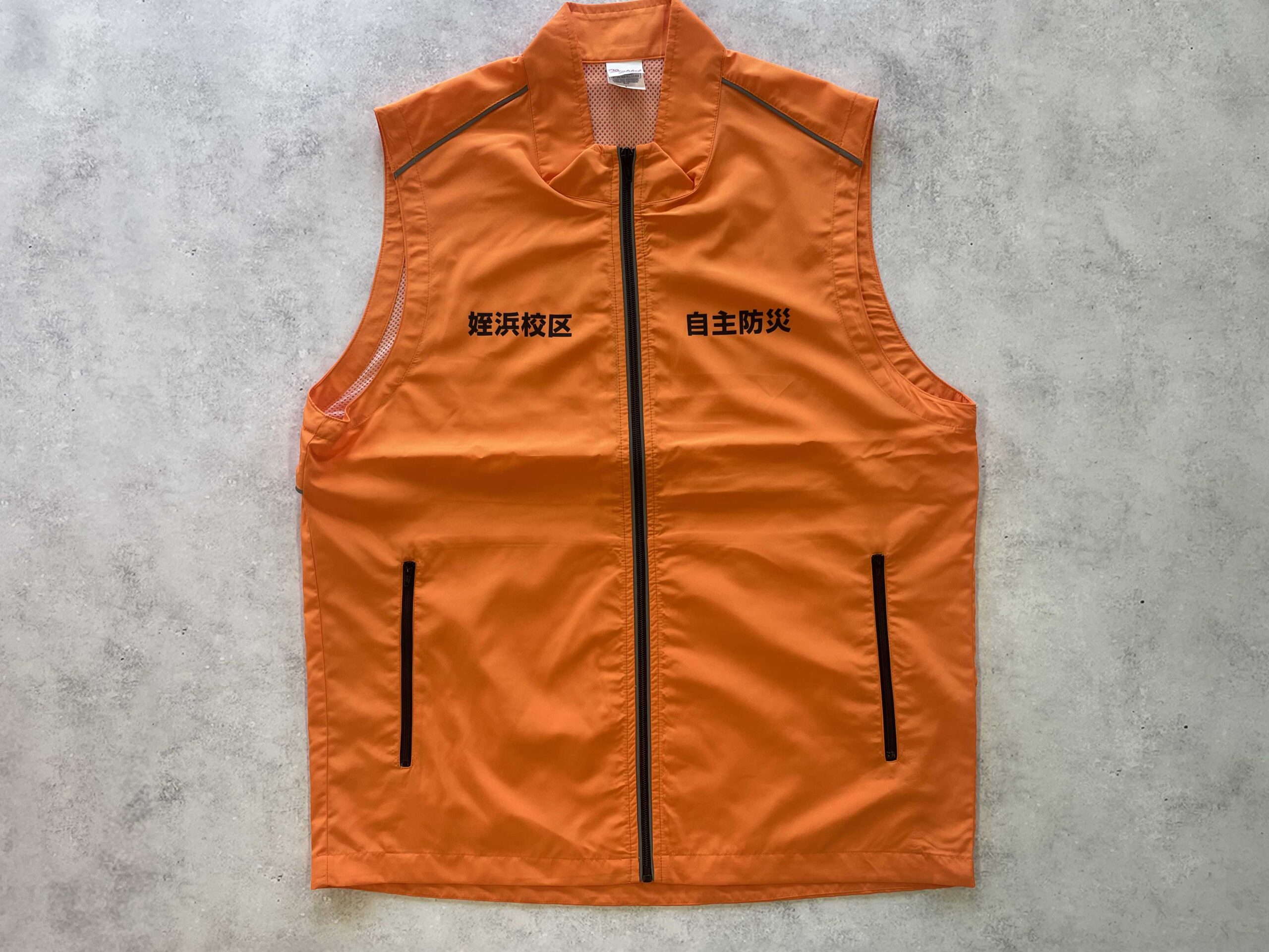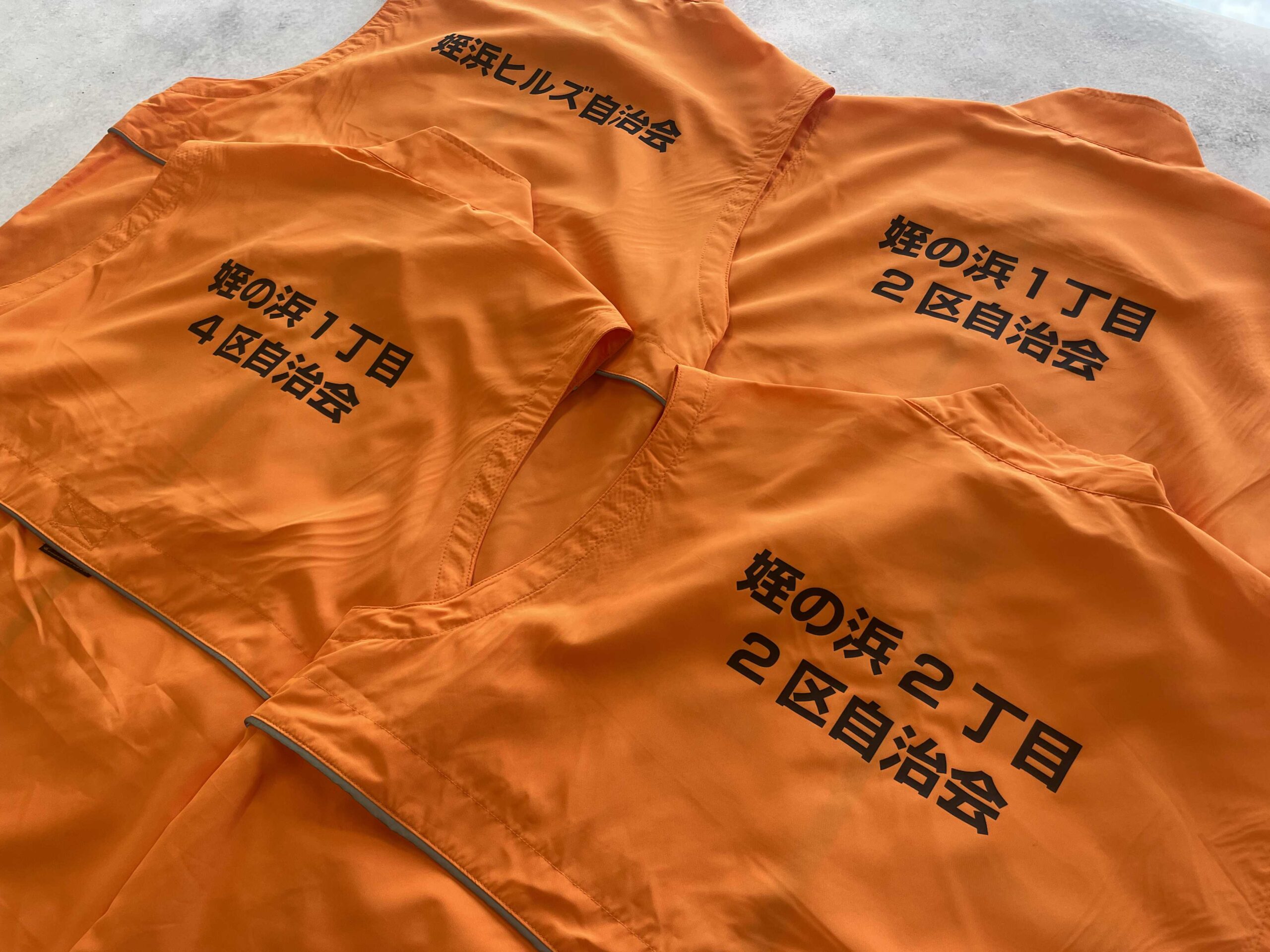 今回は、避難誘導や防災活動の現場でひと目で認識できるよう、視認性の高いオレンジ色のベストを採用。前面には「姪浜校区」「自主防災」の文字を左右に配置し、活動内容がわかりやすいデザインに仕上げました。背面には自治協議会内の 16種類の丁名 を丁寧にプリントし、各地区の担当者が着用しても違和感なく使える統一感のある仕様となっています。