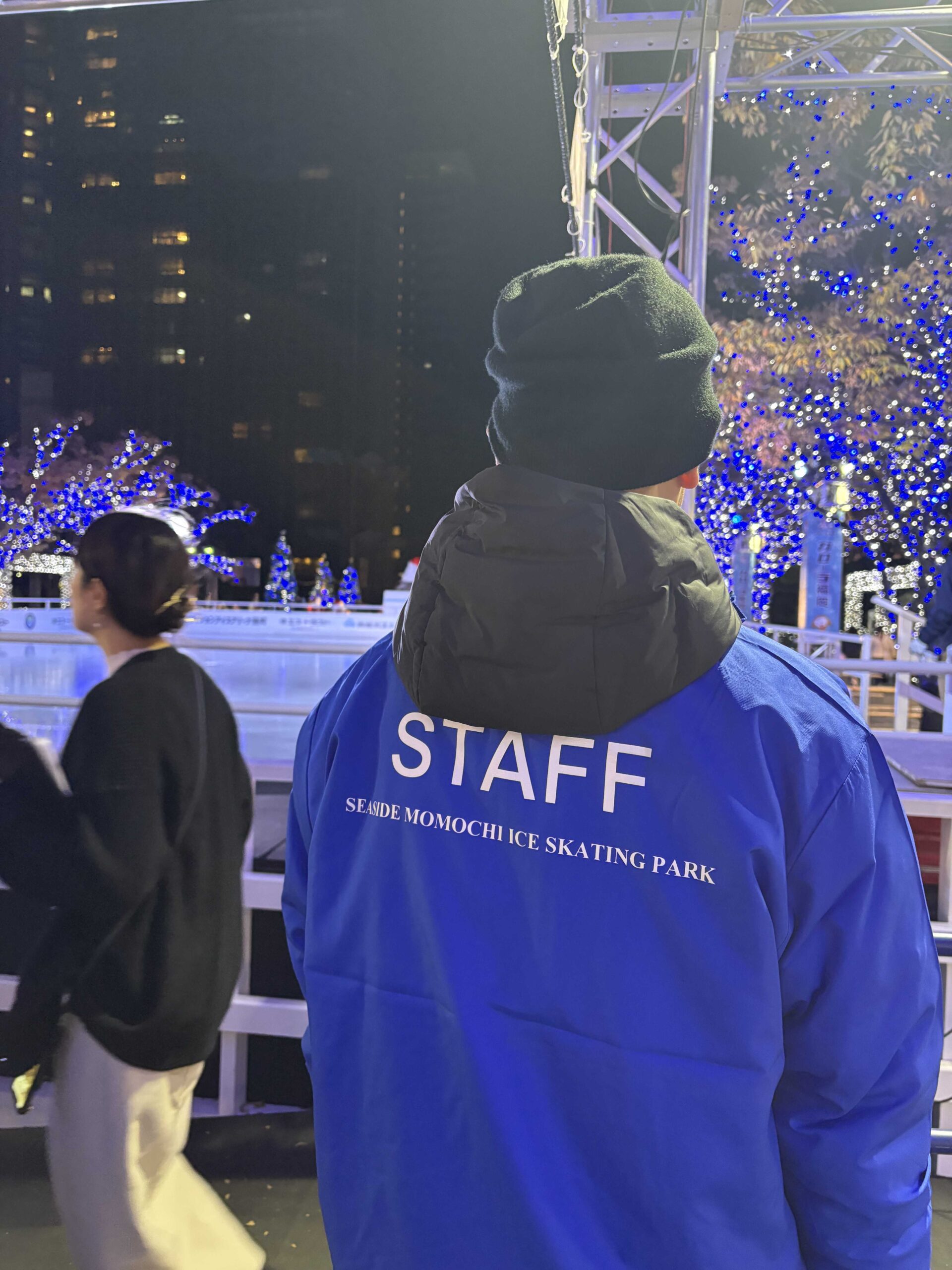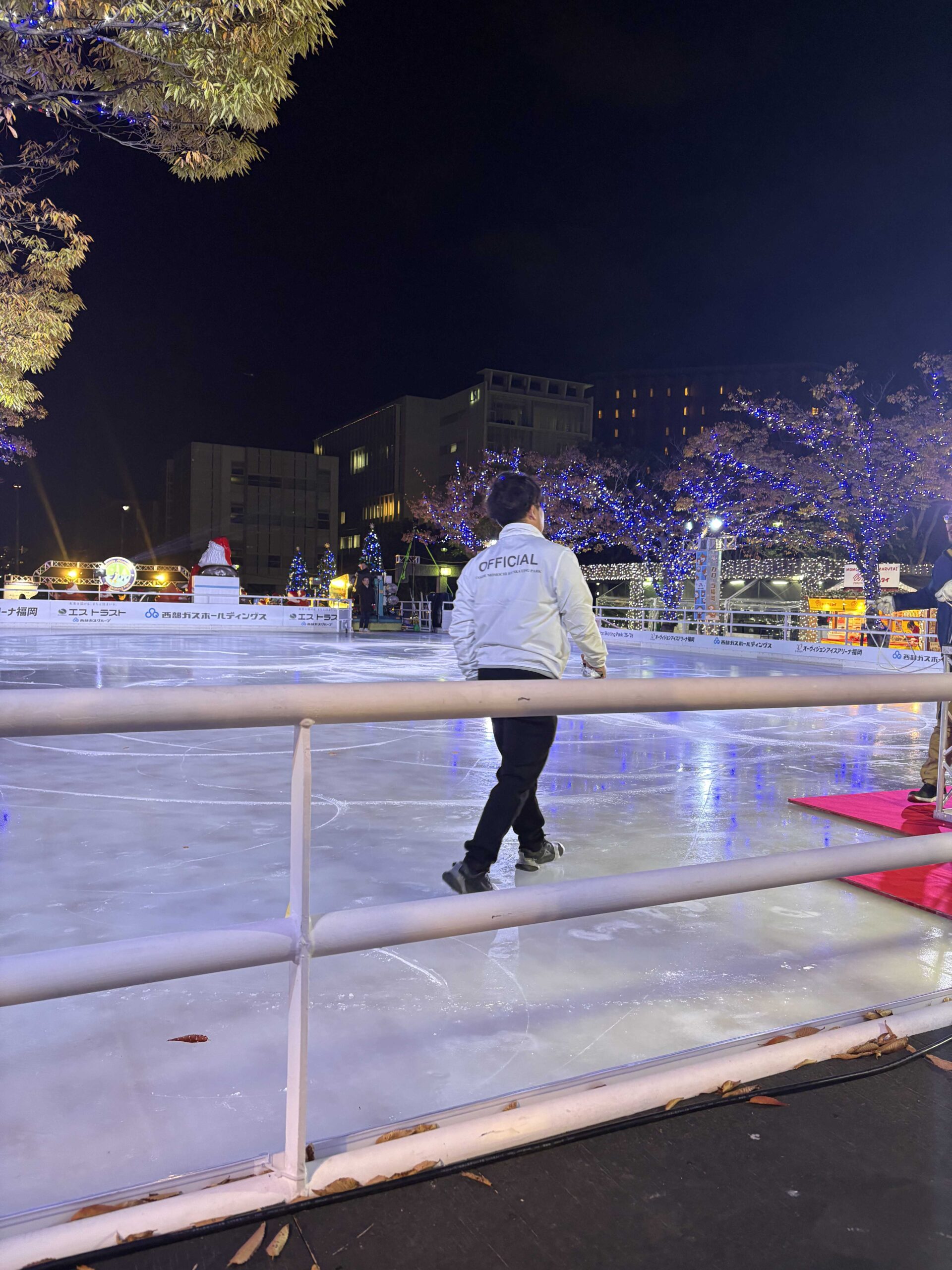 ライトアップされたリンクサイドで動くスタッフのブルゾンが、