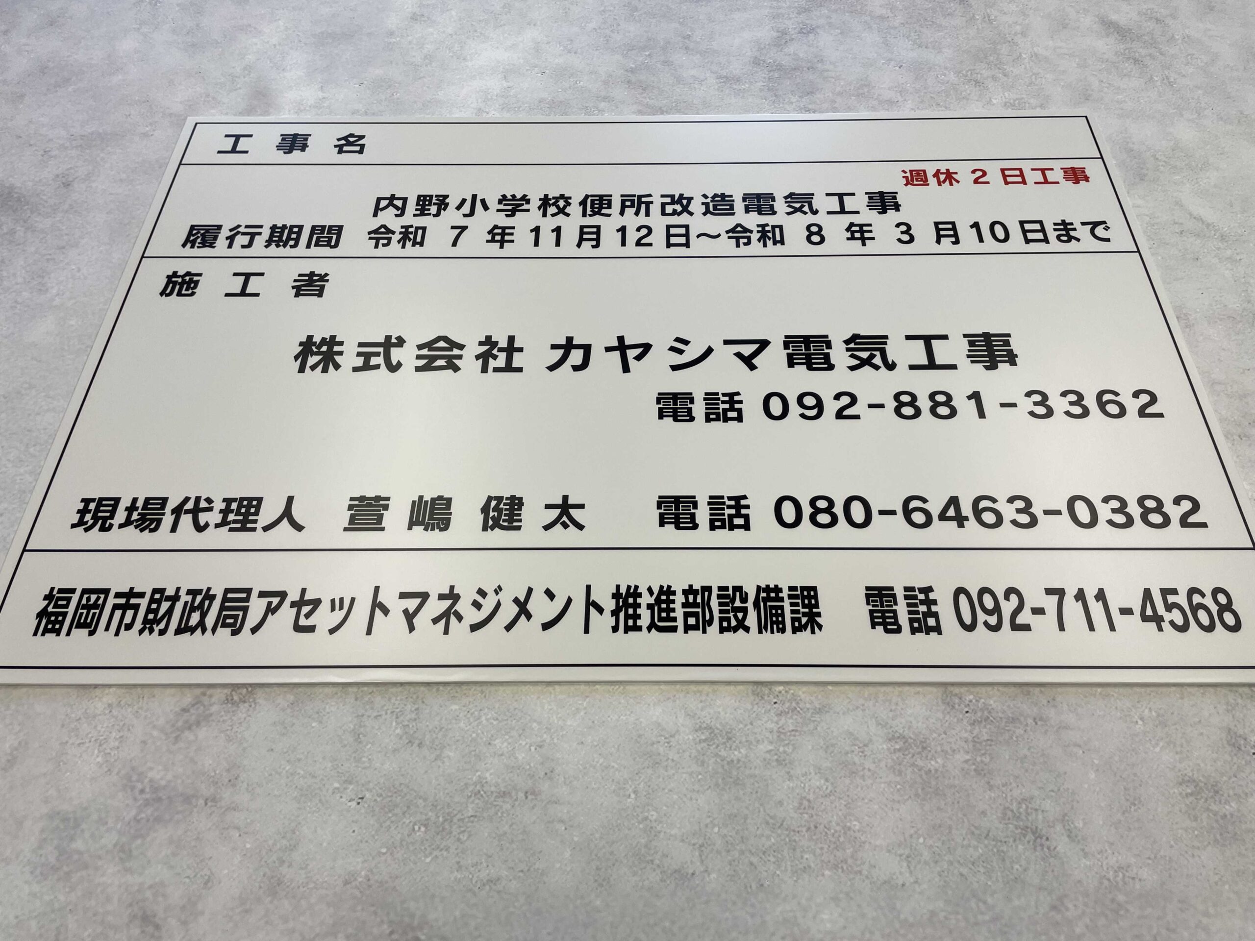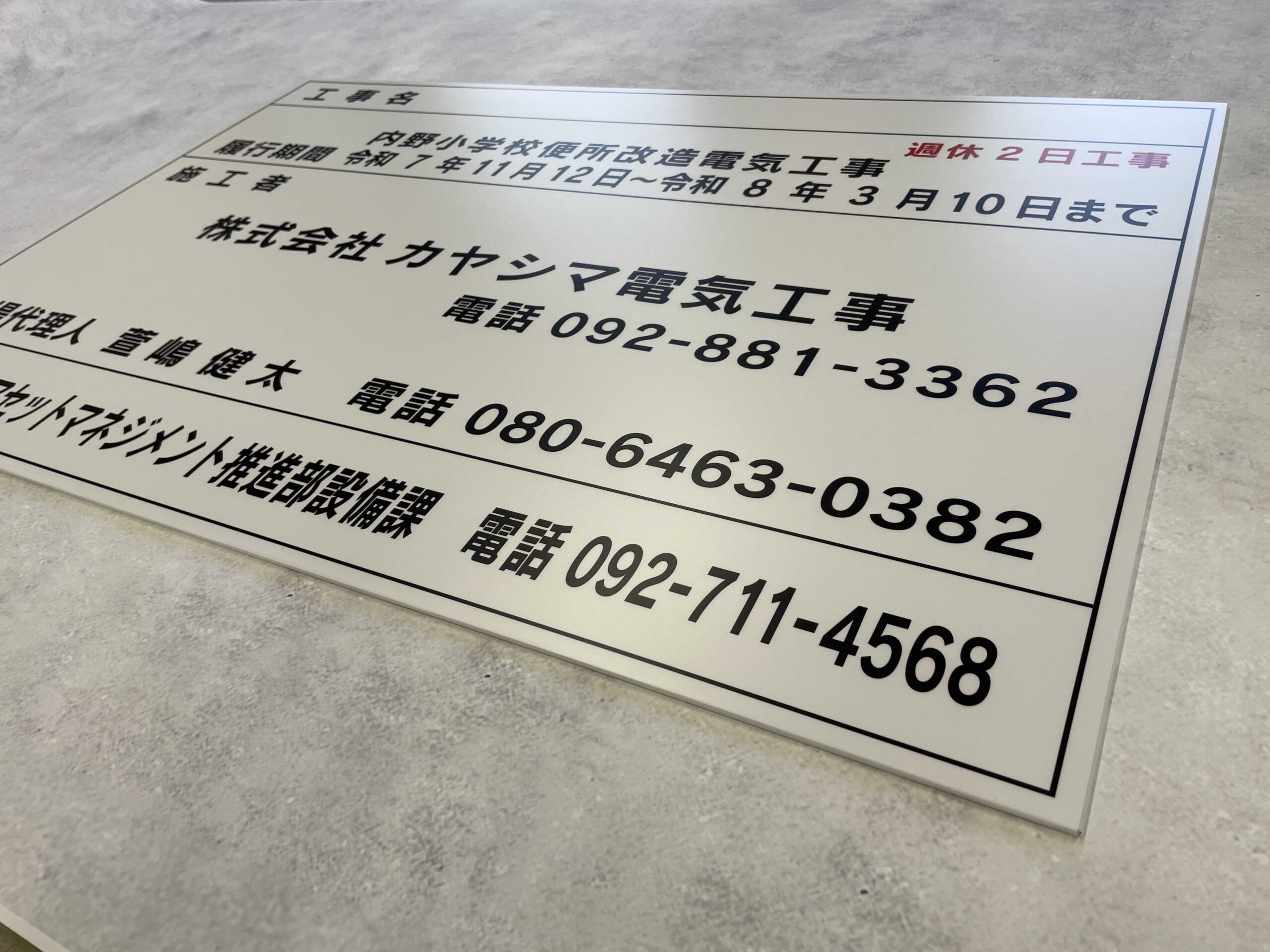 カヤシマ電気工事様より「工事表示看板」のご依頼をお請けしました。